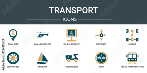 set of 10 outline web transport icons such as tram stop, small helicopter, school bus stop, movement, chassis, alloy wheel, sail boat vector icons for report, presentation, diagram, web design,