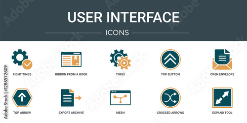 set of 10 outline web user interface icons such as right tings, ribbon from a book, tings, top button, open envelope, top arrow, export archive vector icons for report, presentation, diagram, web