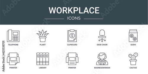 set of 10 outline web workplace icons such as telephone, plant, clipboard, desk chair, sushi, printer, library vector icons for report, presentation, diagram, web design, mobile app