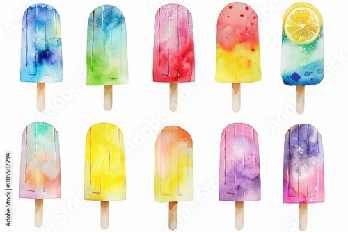 Set of 10 Watercolor Popsicles. Isolated on White Background. Creative Popsicle Decoration Element