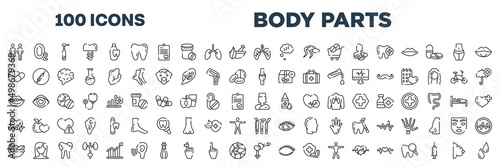 set of 100 outline body parts icons. editable thin line icons such as family of heterosexual couple, lungs with the trachea, medicine capsule, ball of the knee, smiling mouth showing teeth, medical