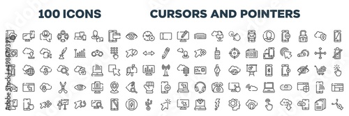 set of 100 outline cursors and pointers icons. editable thin line icons such as book on internet cloud, screen with pencil, vintage camera, , cracked screen, server for cloud, tablet and laptop,