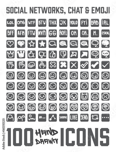 Set of 100 Social Network and chat themed hand drawn / doodled icons. You can see expresions, chat bubbles, emoji / smiles and more! Grouped, ready to quick use!