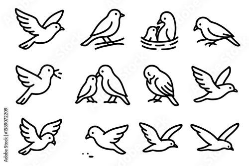 Set of 12 bird icons on dark background: flying, nesting, perched