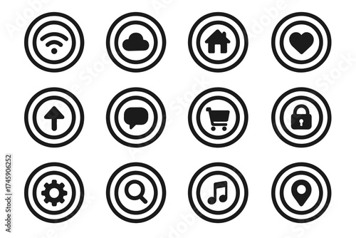 Set of 12 black circle communication and technology icons