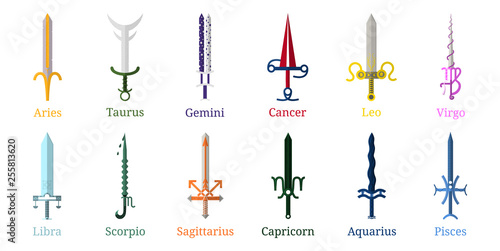 Set of 12 Zodiac Swords. Zodiacal Weapon Collection: Aries, Taurus, Gemini, Cancer, Leo, Virgo, Libra, Scorpio, Sagittarius, Capricorn, Aquarius, Pisces. Vector illustration for Your Design.