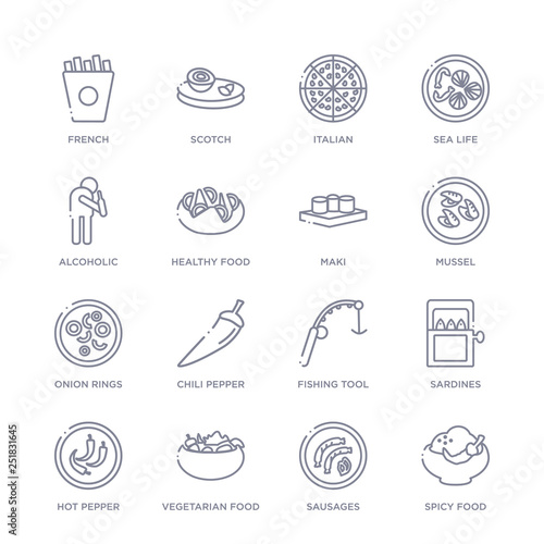 set of 16 thin linear icons such as spicy food, sausages, vegetarian food, hot pepper, sardines, fishing tool, chili pepper from food collection on white background, outline sign icons or symbols
