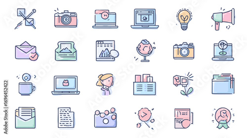 Set of 24 black line icons on a pink background, including cameras, laptops, plants, and various objects, suitable for digital and print design.