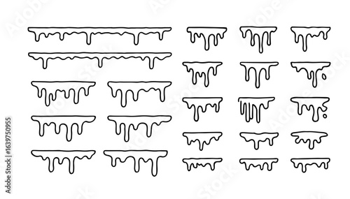 Set of 24 dripping shapes in cartoon doodle outline style. Liquid borders and slime textures for Halloween, paint, goo, blood, or melting effects. Minimal black line design on white background