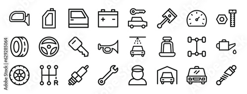 set of 24 outline web automobile icons such as rearview mirror, gasoline, car door, car, car, piston, speedometer vector icons for report, presentation, diagram, web design, mobile app