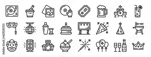 set of 24 outline web event icons such as record player, champagne, picture, vinyl, ticket, beer mug, drum vector icons for report, presentation, diagram, web design, mobile app