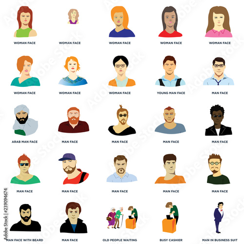 Set Of 25 icons such as Man in business suit with vest. Elegant businessman costume, face, Woman face beard, Arab icon