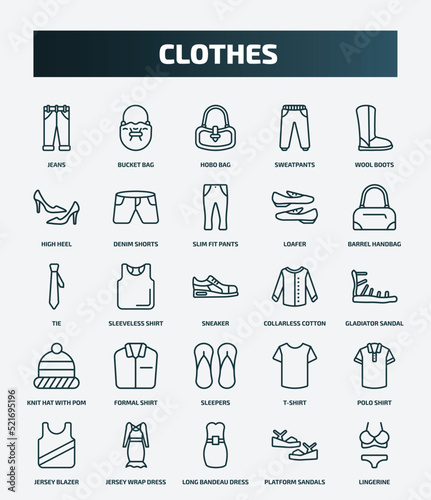set of 25 special lineal clothes icons. outline icons such as jeans, bucket bag, wool boots, slim fit pants, tie, collarless cotton shirt, formal shirt, polo shirt, long bandeau dress, platform
