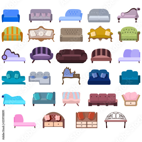 Set of 29 different sofas and couches. Furniture for apartments and offices. Collection of comfortable lounge for interior design. isolated. Retro-style. Different models of settee icons.