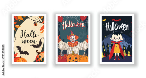 Set of 3 Halloween Card, Poster, hand drawn cute flyer. Postcard with letter "Halloween". Bats, Pumpkins, Zombies, Scarecrows, Witches... Background. Vector illustration