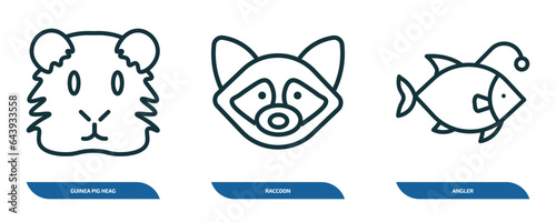 set of 3 linear icons from animals concept. outline icons such as guinea pig heag, raccoon, angler vector