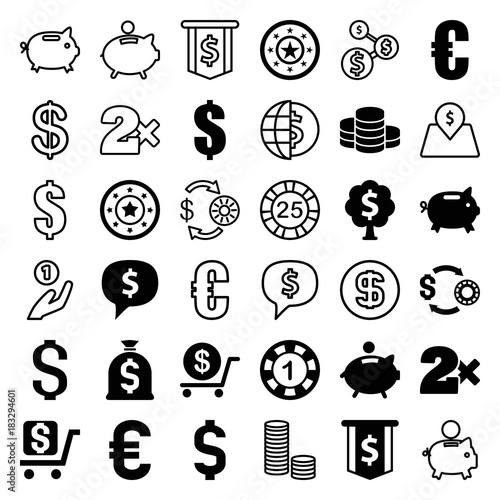 Set of 36 coin filled and outline icons