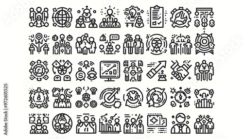 Set of 36 line icons related to society, teamwork, cooperation. Outline icon collection. Editable stroke. Vector illustration