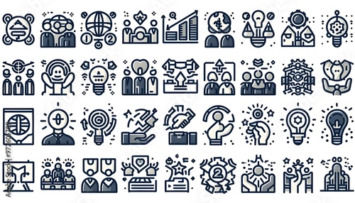 Set of 36 line icons related to society, teamwork, cooperation. Outline icon collection. Editable stroke. Vector illustration