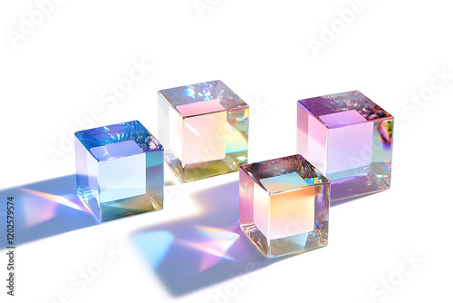 Set of 3d crystal glass cubes with refraction and holographic effect isolated on a white background