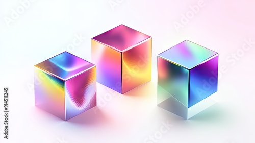 Set of 3D geometric cubes with vibrant gradient hologram colors, displayed against a white background, creating a modern and realistic vector illustration.