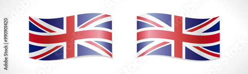 Set of 3D waving flags of the United Kingdom of Great Britain. Isolated design. Badge template. Web icon. Business, sport or tourism concept. T shirt graphic. Set of UK flag symbols. Creative elements