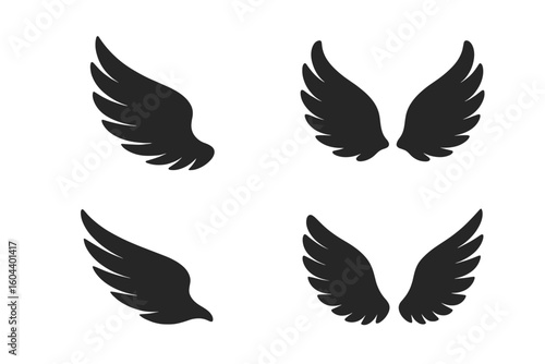 Set of 4 Black Wing Silhouette Icons, Bird and Angel Wings, Feathered Wing Elements, Elegant Flight Symbols, Isolated Vector Collection, Decorative Emblem Clipart for Design, Transparent Background