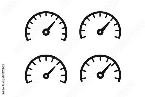 Set of 4 dashboard gauge icons. Vector speedometers, analog meters, tachometers, car instrument dials, performance indicators, fuel level symbols. Automotive dashboard cluster isolated illustration.