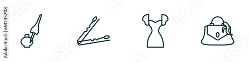 set of 4 linear icons from woman clothing concept. outline icons included liquid eyeliner, hair clip tool, female dress, handbag of female vector