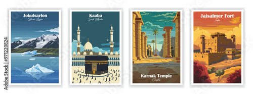 Set of 4 Vintag travel posters, Vintage travel illustrations, Vector colorful illustrations. Trendy printable wall art with beautiful landscapes.