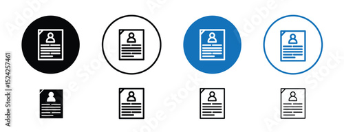 Set of 5 pixel perfect colored Resume icon with 1 unexpanded, 1 silhouette, Icon of a resume document with profile picture and text.