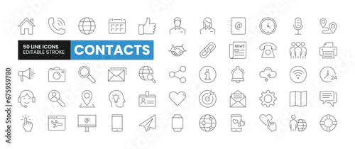 Set of 50 Contact Us line icons set. Contact Us outline icons with editable stroke collection. Includes Team, Assistance, Feeback, Idea, Calendar and More.