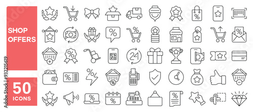 Set of 50 line icons related to shop offers, gift, percent, sale, discount, bonus, reward, loyalty, benefit, prize, Editable stroke. Vector illustration