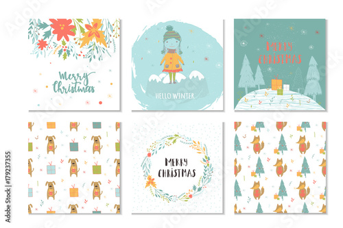 Set of 6 cute Christmas gift cards with lettering Merry Christmas and patterns.