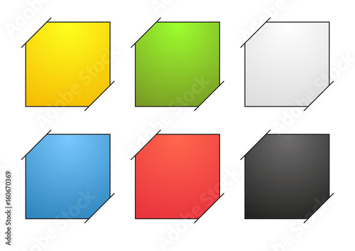 Set of 6 isolated colorful blank banners with black outline, or note with corners stuck in paper (white background), each note is filled with colorful gradient