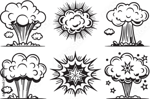 Set of 6 outline icons related to comic burst explosion. Linear icon collection of bombs. Editable stroke line art. Vector illustration.