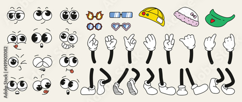Set of 70s groovy comic vector. Collection of cartoon character faces in different emotions, hand, glove, glasses, hat, shoes. Cute retro groovy hippie illustration for decorative, sticker.