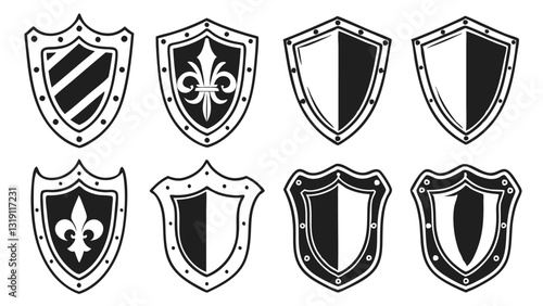 "Set of 8 Black and White Shield Icons – Vintage Heraldic Badges, Security Emblems, and Coat of Arms Symbols for Design and Branding"