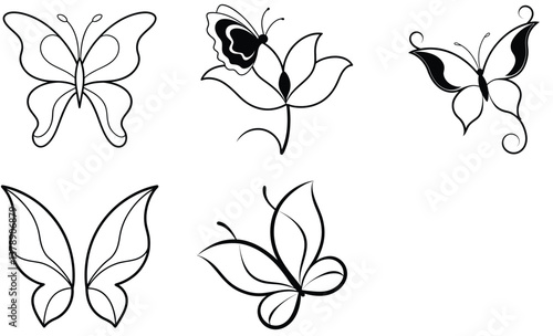 Set of a black and white, creativity, engraving, butterfly line art simple vector design