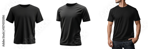 Set of a black T-shirt template with front, back, and side views, isolated on a transparent background.