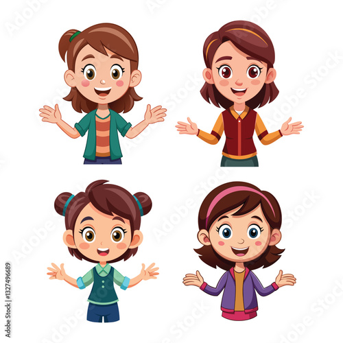 Set of a flat illustration of a girl cartoon both arms open in different fashions a dress