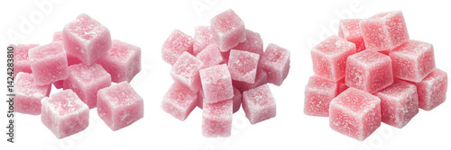 Set of a, Pink sugar cubes of Turkish delight candy, isolated on a transparent background.