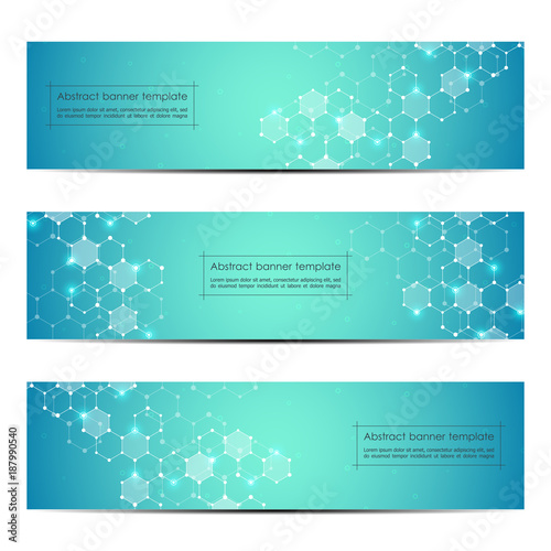 Set of abstract banner design, dna molecule structure background. Geometric graphics and connected lines with dots. Scientific and technological concept, vector illustration.