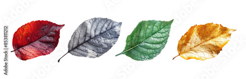 Set of abstract colours leaves such as green,grey,red and golden isolated on transparent background.