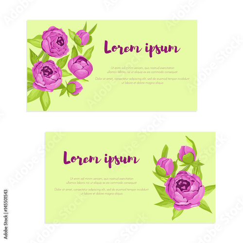 Set of abstract elegance cards with purple peonies for wedding invitation, marriage card, congratulation banner, advertise