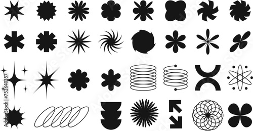Set of Abstract Geometric Shape in Brutalism Style. Minimalist Bauhaus Element. Flower, Star, Swirl, Spiral, Arrow