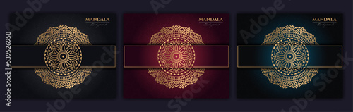 Set of abstract gold luxury mandala background vector template, Circular ornamental arabesque pattern for poster, cover, brochure, flyer. Red, green, blue background with ethnic floral mandala element