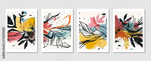 set of abstract vector backgrounds featuring tropical leaves. Hand-drawn textures suitable for wall decoration, postcard designs, or brochure covers.