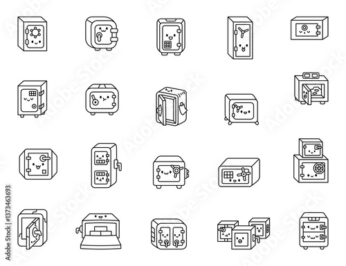 Set of adorable cartoon safes with smiling and sleeping expressions created as secure lockable boxes for storing valuables with protection and safety in mind, for yours creative designs projects