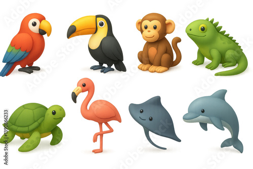 Set of animal characters, including a turtle, a dolphin, a flamingo, a monkey